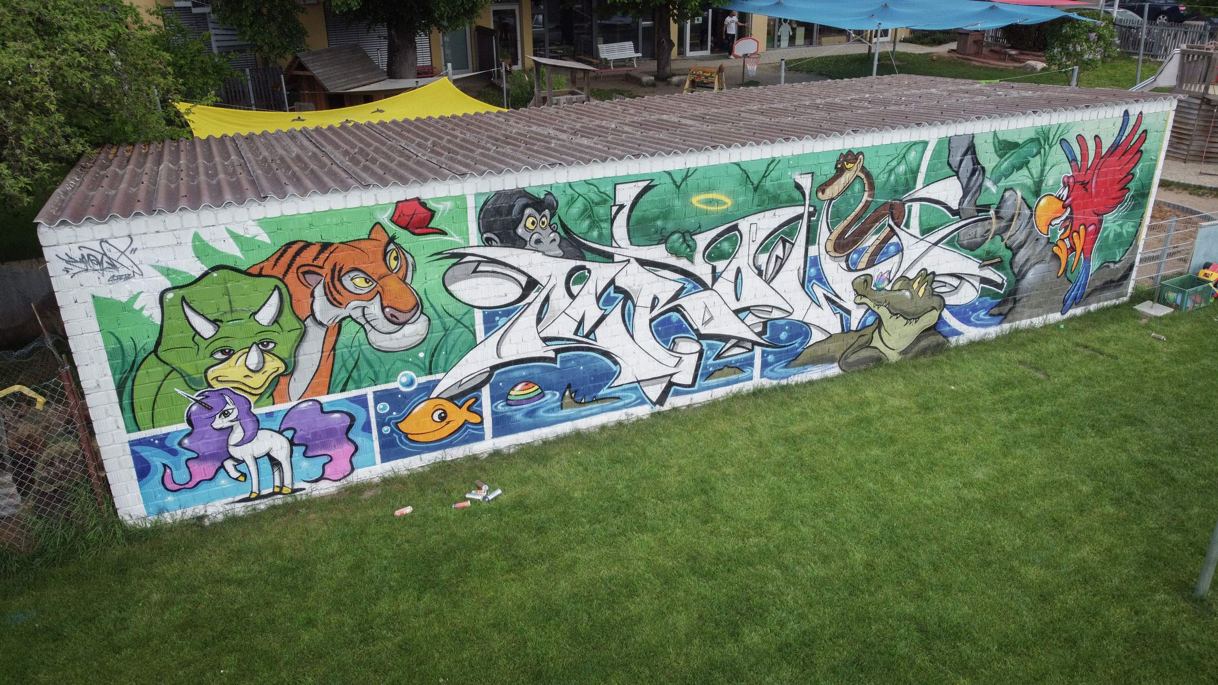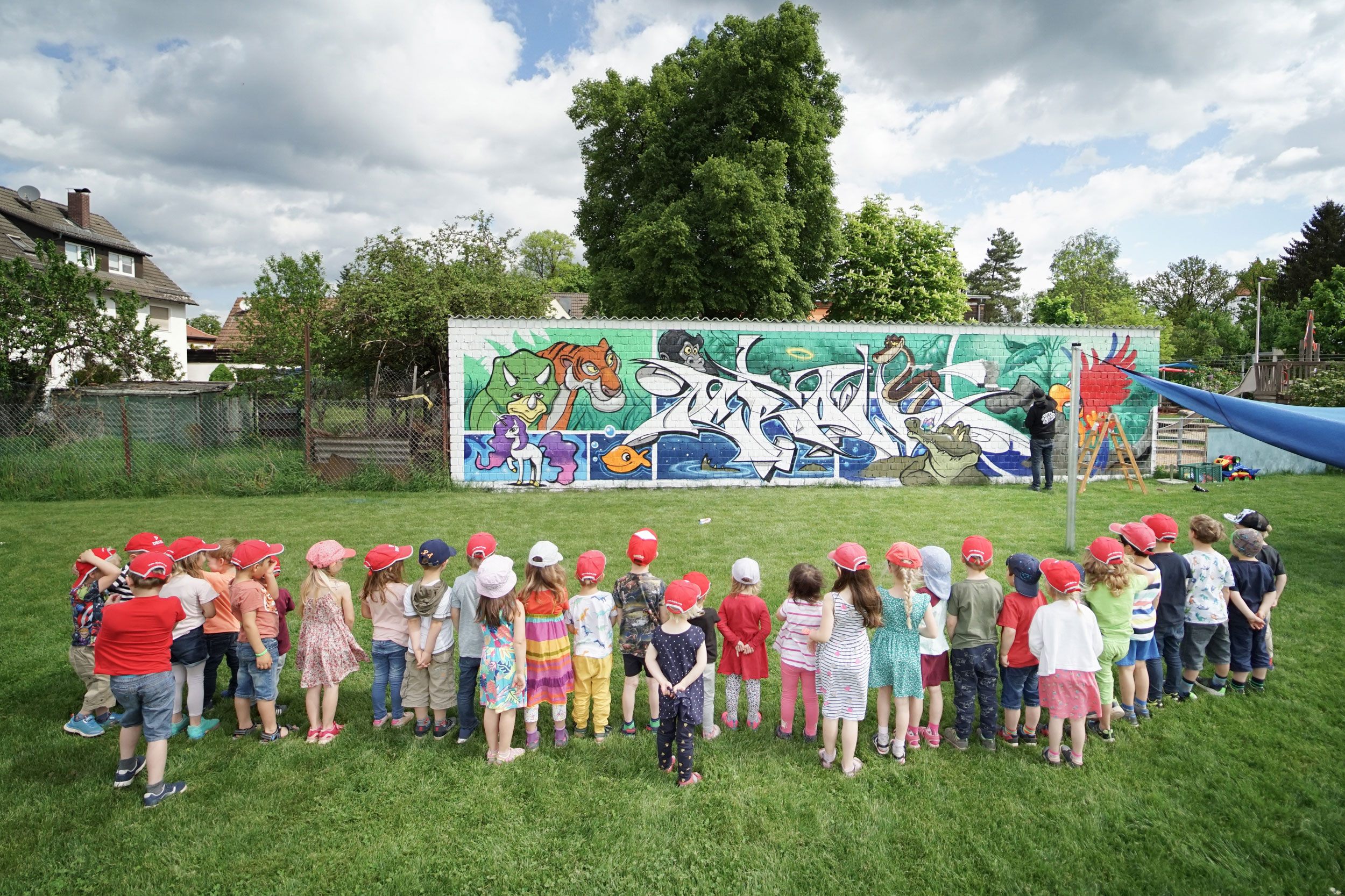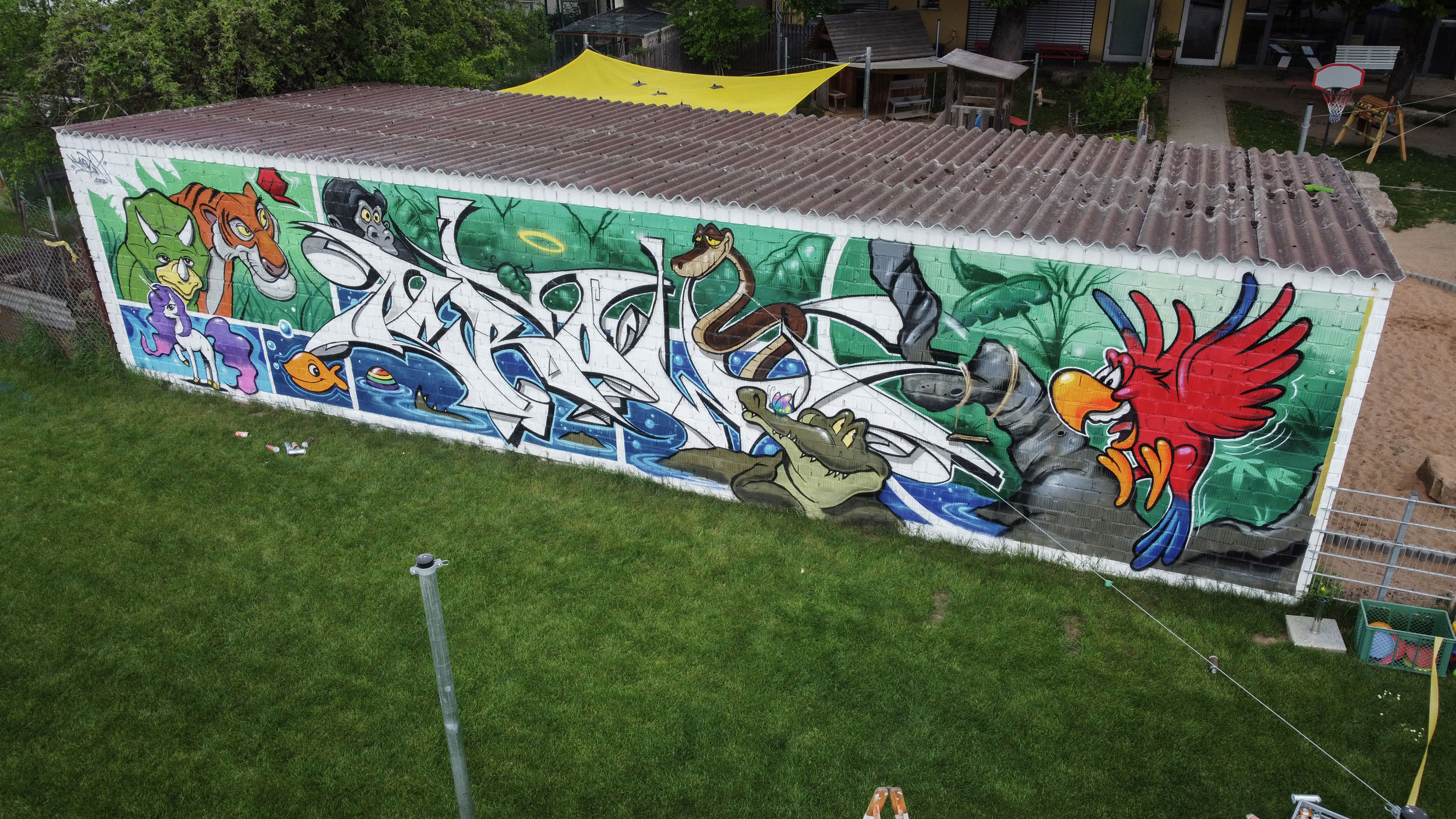 Der Graffiti-Künstler Kid Crow aka Carlos Lorente war für die Planung und Umsetzung des Werkes zuständig und zauberte dieses Meisterwerk innerhalb von zwei Werktagen. Die Kinder der Tagesstätte konnten vorab sogar Ihre Motiv-Wünsche äußern, welche der Künstler mit Freunde umsetzte.