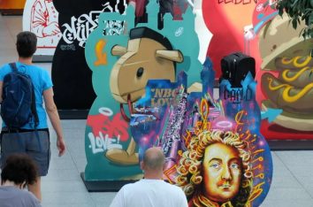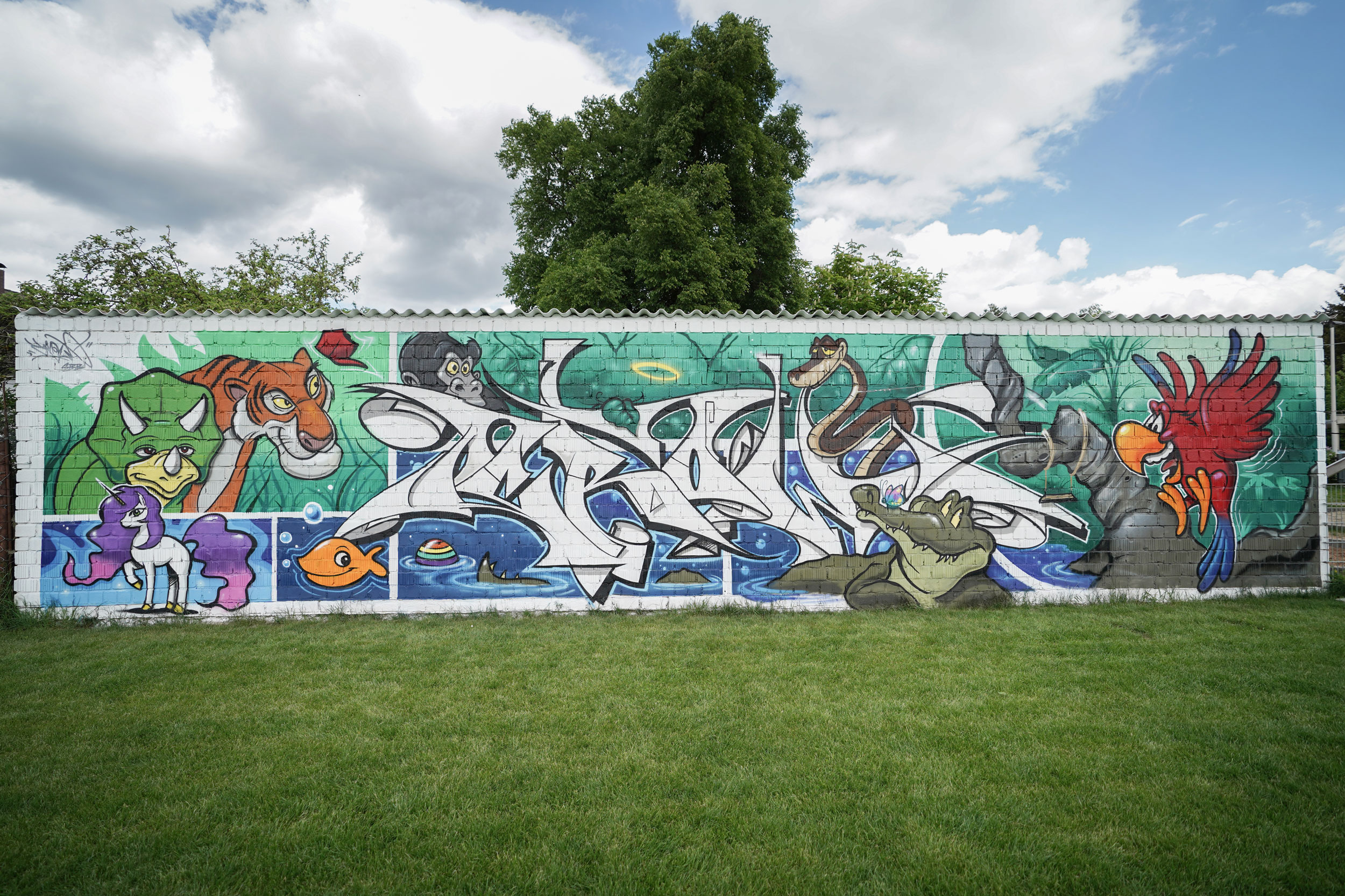 Eine leere und dreckige Wand an einem angrenzenden Kindergarten-Spielplatz ist öde und nur wenig einladend. Aus diesem Grund wurde die Fläche in Nürnberg Fischbach mit vielen Motiven aus Kinderfilmen im Streetart-Stil gefüllt und damit der Wand einen neuen Look verpasst, was Kinderaugen zum leuchten bringt.